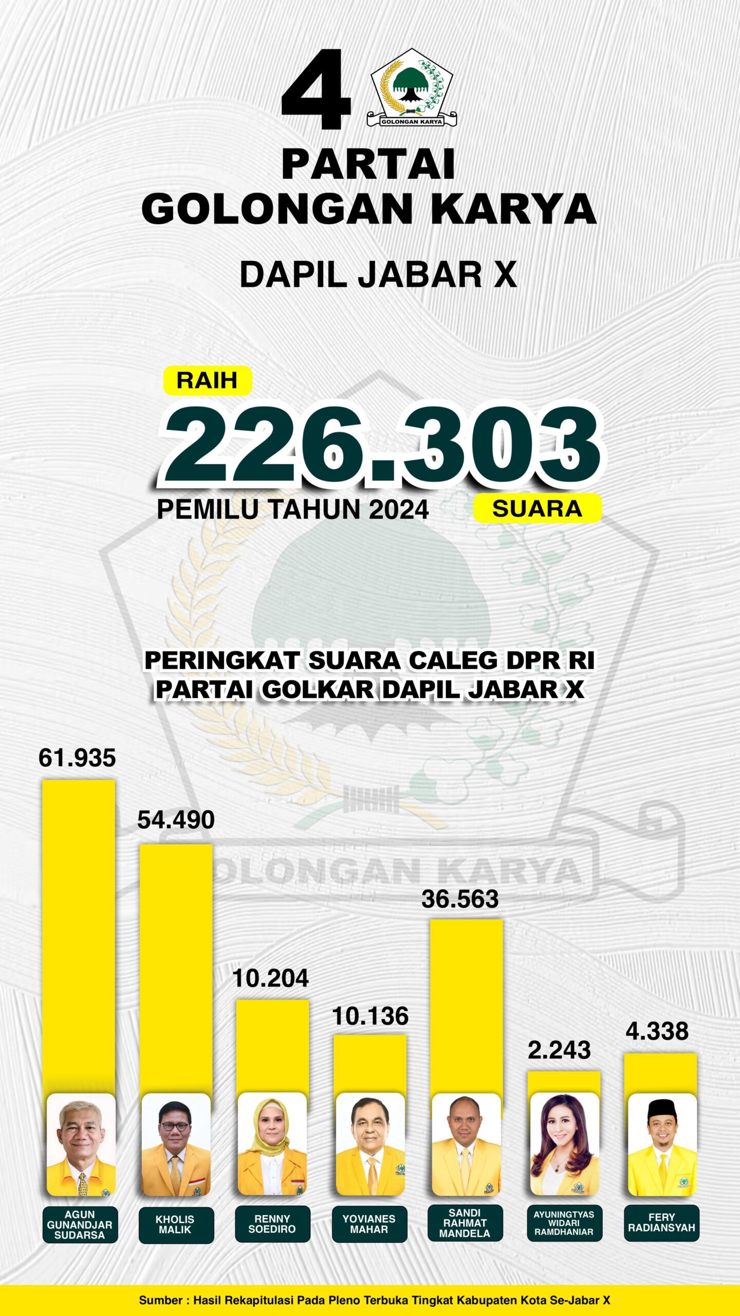 Untuk di dapil Jabar X sesuai dengan hasil pleno tingkat Kabupaten dipastikan sejauh ini Partai Golkar masih bisa dapat mempertahankan satu kursi di Senayan.